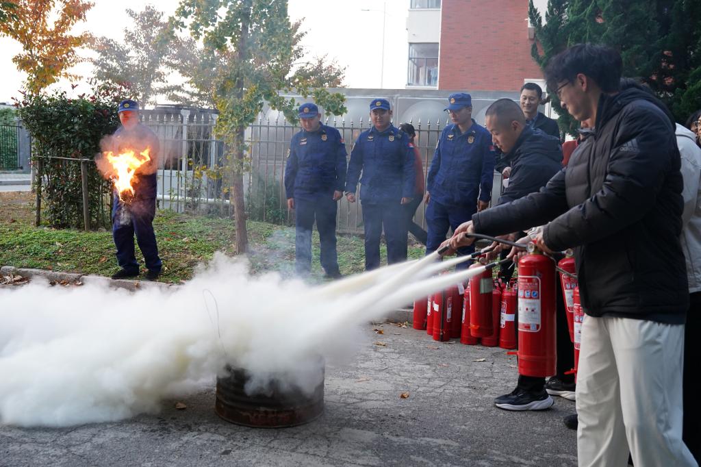 随后进入实战培训环节,学院特邀安全管理处消防科邵建华老师主讲。邵老师围绕“宿舍安全用电”“实验室消防安全”等,讲解火情应急流程,重点演示了手提式干粉灭火器“提、拔、握、压”操作及消火栓使用方法。师生依次实操体验,切实掌握初起火灾扑救技能。