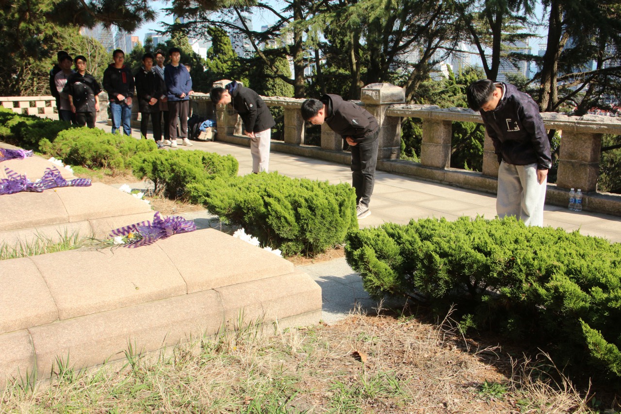 到达烈士纪念馆后,同学们在“山河魂”烈士群雕前举行了庄严肃穆的悼念仪式。雄浑的《国际歌》响彻云霄,同学们凝视烈士群雕,深情缅怀革命先烈,对为人民解放事业而献出生命的革命英烈表达崇高的敬意与沉重的哀悼。悼念仪式结束后,同学们怀着沉重的心情前往纪念馆的墓区,在庄严肃穆的氛围下,全体同学依次向烈士献花致礼,鞠躬致敬。