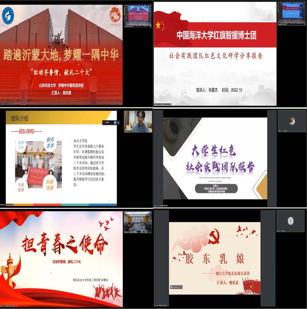 在党的二十大即将召开之际,为弘扬齐鲁红色文化,传承山东红色基因,深化驻鲁高校大学生红色实践团队研学活动,10月10日,“红动齐鲁情,献礼二十大”——驻鲁高校大学生红色社会实践团队联学共建活动在山东科技大学举行。来自山东科技大学、中国海洋大学、青岛科技大学、齐鲁工业大学、青岛农业大学、烟台大学六所高校社会实践团队相关学院团委书记、指导老师、团队成员代表线上线下参与活动。山东科技大学团委书记尹立明、研究生工作部副部长刘松、学生工作部副部长靳凯、必赢3003no1线路检测中心党委副书记陈猛出席启动仪式。本次活动由山东科技大学必赢3003no1线路检测中心团委书记樊玉华主持。