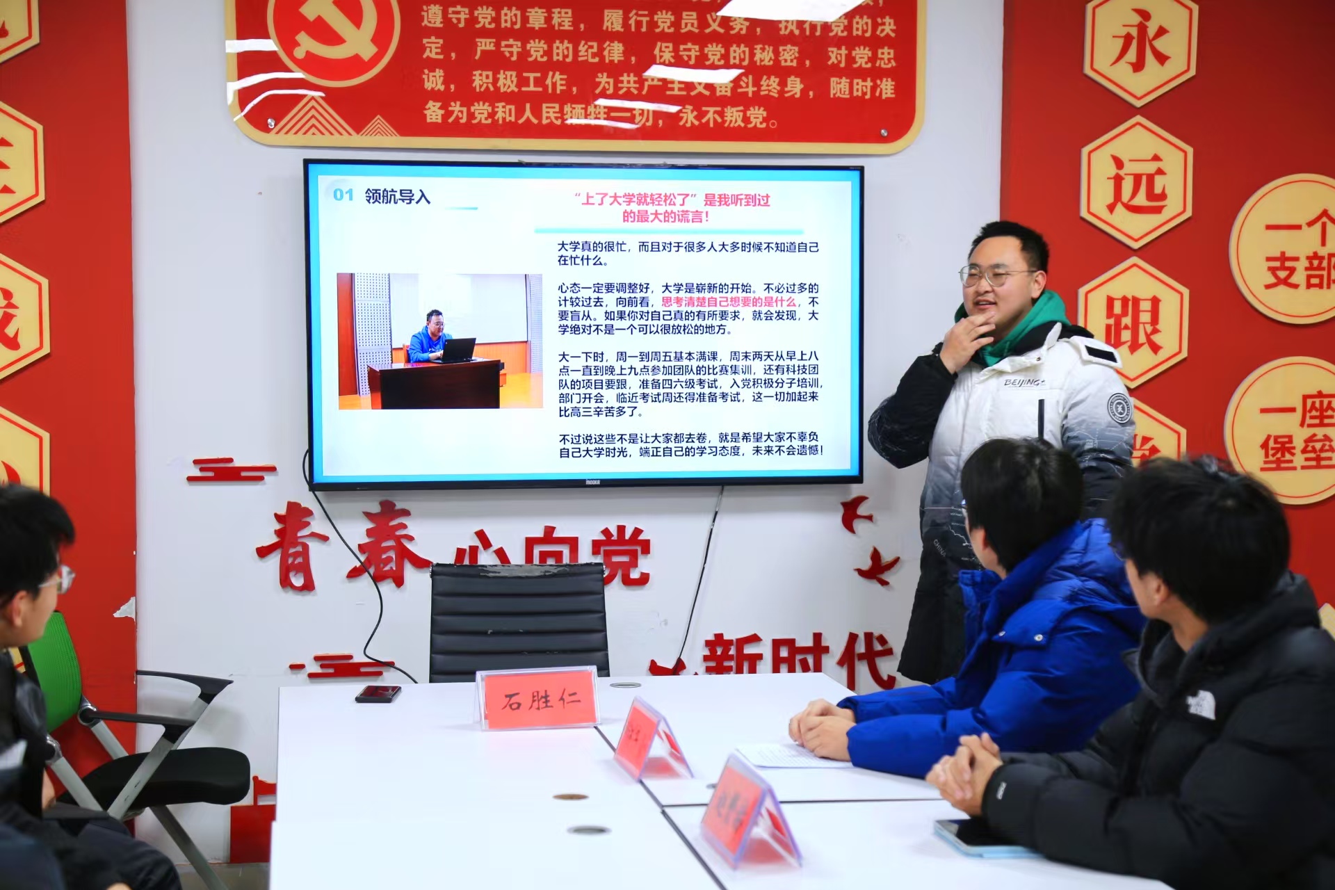 会议上,四位优秀学生代表向在场的同学们分享了自己的成长历程和宝贵经验。杨子豪同学以“目标是灯塔,坚持是船桨”为题,分享了他如何设定目标并坚持不懈地在学术和科研的道路上追求卓越。石胜仁同学以“拼搏奋进——勇敢的人先享受世界”为题,介绍了自己的成长经历,同时分享了自己的大学规划和未来目标。张凯媛同学则以自己的经历为例,讲述了坚持不懈和努力学习的重要性。赵赟赫同学则强调了时间管理的重要性。