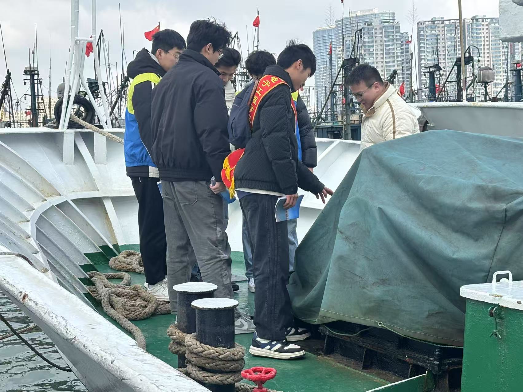 随后,志愿者前往积米崖码头,协助社区工作人员开展“渔港安全伴你行”渔港安全宣传活动。在工作人员引导下,志愿者们参观渔政执法船只,听讲解员讲述渔港安全知识及渔业政策法规,为协助渔港安全宣传打好知识基础。在码头上志愿者协助社区工作者向渔民发放宣传资料,用通俗易懂的语言,为居民们讲解渔港安全相关政策法规,进一步提高渔民的渔港安全观念和渔业法律意识。