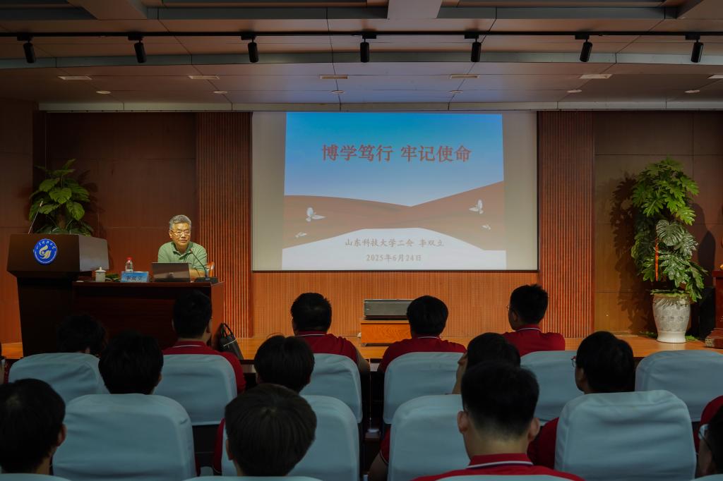 党课中,李双立以山东科技大学74年发展历程为经,以中国共产党百年奋斗史为纬,以必赢3003no1线路检测中心成长轨迹为线,为毕业生党员铺展了一幅“校史-党史-院史”交织的壮阔画卷。他深情回顾了学校从1951年建校至今的峥嵘岁月,从淄博洪山的初创岁月到济南、泰安的扎根发展,再到青岛校区的跨越腾飞,生动诠释了“惟真求新”校训的时代内涵与精神传承。谈及学校在分合搬迁中淬炼出的“坚韧不拔、发奋图强”精神品格,以及在多校合并中凝聚的“爱校奉献、敬业实干”文化传统时,他的讲述中饱含深情:“这些基因密码,是每一位科大人最珍贵的‘精神原乡’。”