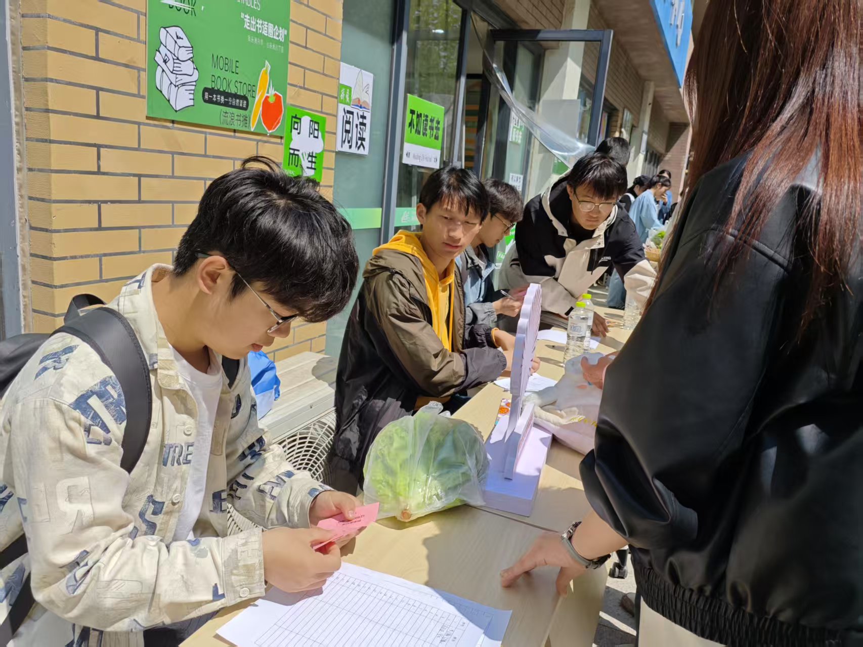 活动现场,“用书香换蔬香,让爱心流动起来”的横幅格外醒目。前来参与活动的同学们络绎不绝,他们纷纷带着自己阅读过的书籍来到现场。根据活动规则,一人捐赠5-10本书籍可换取1包公益果蔬包,捐赠10-15本书籍可换取2包果蔬包,捐赠15本及以上书籍则能换取3包果蔬包。一本本承载着知识的书籍,在志愿者们的引导下,有序地完成登记、分类,随后,饱含着助农心意的果蔬包被递到捐书者手中。
