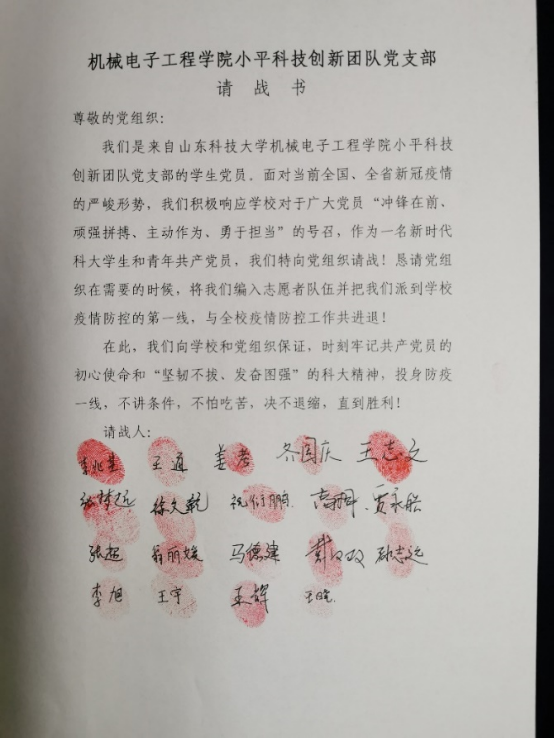 抗击疫情,勠力同心。疫情突然袭来,学校、学院疫情防控严峻,小平科技创新团队党支部全体在校党员第一时间集体请战,郑重签下请战书,用自己的实际行动践行了共产党员的使命与担当,成为校园疫情防控中最美的一抹红色。