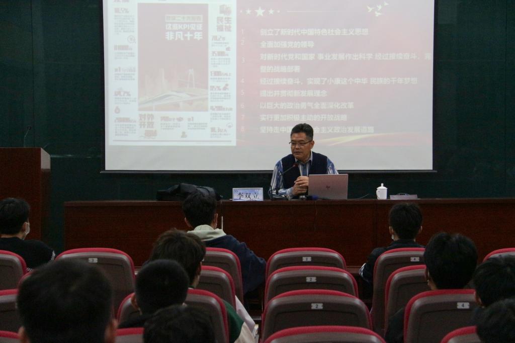 此次讲座以“奋进新征程,永远跟党走——学习贯彻落实党的二十大精神和青年马克思主义者培养”为主题。李双立从对党的二十大的概况、二十大报告的框架结构与主要内容等七个方面做了详细介绍,他表示,如今的中国在高速的发展,实现中华民族伟大复兴的中国梦距离我们越来越近。李双立强调,青年人必须要胸怀天下,心胸狭隘的人是成不了大事的,未来是属于青年人的,同学们要努力奋斗不负韶华,为成为共产主义的接班人而不断努力。最后,他勉励同学们要多读书,了解历史,了解哲学,不断提高自身素质,争做一名优秀的青年马克思主义者。